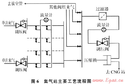 40口先導(dǎo)性試驗項目井中,在氣田內(nèi)建設(shè)集氣站,增壓到0.6MPa后經(jīng)過外輸管道輸送到CNG加氣站,通過CNG罐車外銷。由于集氣站建設(shè)在氣田內(nèi),所以集氣站內(nèi)建設(shè)有1個閥組,氣體進(jìn)入閥組后,首先調(diào)壓,壓力調(diào)整為0.2MPa,單井產(chǎn)氣可利用閥門倒換流程進(jìn)行單井輪換計量。集氣站閥組產(chǎn)氣和其他閥組來氣在匯管進(jìn)行匯合,經(jīng)過過濾分離、總計量和調(diào)壓后進(jìn)入集氣站壓縮機(jī)增壓,壓力增加到0.6MPa后,進(jìn)入外輸管道,送往CNG站。該集氣站主要流程如圖6所示。