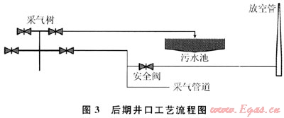 在該段流程中,水通過抽油機(jī)從油管中抽出,直接排放到井場附近的排污池,自然蒸發(fā)。煤層氣從套管和油管間的環(huán)形空間產(chǎn)出,通過采氣管道,進(jìn)入煤層氣采集系統(tǒng),系統(tǒng)壓力為0.2MPa。當(dāng)采氣系統(tǒng)檢修時,打開放空閥,通過放空管把井口里的煤層氣連續(xù)排放到大氣中。該井口工藝流程及如圖3所示。