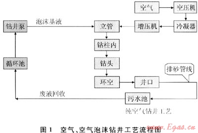 空氣、空氣泡沫鉆井是以空氣或空氣泡沫作為循環(huán)介質(zhì),采用潛孔錘沖擊鉆進工藝技術(shù)進行鉆井[4~5],其工藝流程如圖1所示。在潘河示范工程采用空氣、空氣泡沫鉆井?dāng)?shù)約占總井?dāng)?shù)的60%。