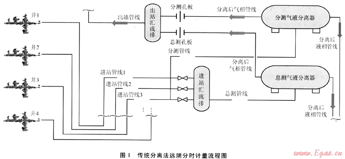 目前,我國井口天然氣計量現(xiàn)狀主要有以下3種情況:①利用分離法遠端分時計量;②傳統(tǒng)的單相測量儀表計量;③根本不計量。傳統(tǒng)的分離法計量是將若干個氣井產(chǎn)物分別采用獨立管線集中輸送到遠端中心集氣站,由集氣站內(nèi)的氣液分離設備對分離后的氣液兩相分別進行計量,其流程如圖1所示,通過對進站閥組流程的切換實現(xiàn)遠端天然氣氣井的流量分時測量。這種方法存在流程復雜、占地廣、設備龐大、成本高、需要獨立敷設輸送管線和不能實現(xiàn)對每口井實時計量等問題。