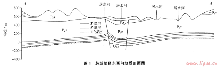 韓城地區(qū)隸屬于陜西省渭南市,地處關(guān)中平原的東北側(cè)。構(gòu)造上位于鄂爾多斯盆地渭北隆起的東南緣,東面以黃河和韓城大斷裂為界,南臨渭河地塹,西南與澄臺礦區(qū)毗鄰,面積約為1500km2。研究區(qū)構(gòu)造活動(dòng)平穩(wěn),區(qū)域上由南向北、由東向西逐漸變?nèi)?,一般邊淺部相對于中深部復(fù)雜。北部以擠壓構(gòu)造變形為主,呈北東南西向;南部主要為拉伸構(gòu)造變形,有2個(gè)主導(dǎo)方向,即北東南西向和東西向,總體構(gòu)造形態(tài)是一個(gè)傾向北西的具波狀起伏的緩斜大型單斜構(gòu)造(圖1)。韓城地區(qū)主力產(chǎn)氣煤層分別為山西組3t煤層和太原組5#、11#煤層。山西組為陸相沉積,主要為河流沖積 三角洲沉積體系;太原組為海陸交互相沉積,主要為海灣一漏湖沉積體系。煤系地層基底為石炭系本溪組的鋁土質(zhì)泥巖[1~4]。