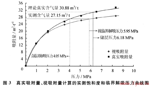 選取安陽礦區(qū)雙全井田-煤層氣參數(shù)井實(shí)測(cè)儲(chǔ)層參數(shù)及等溫吸附數(shù)據(jù),求取了真實(shí)吸附量和視吸附量下的吸附參數(shù),及由此推導(dǎo)出臨界解吸壓力和實(shí)測(cè)飽和度(表2、圖3)。等溫吸附實(shí)驗(yàn)溫度為20℃,測(cè)試煤層為二1煤層。