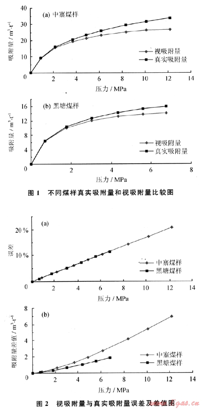 結(jié)果顯示(圖1、2):在相對(duì)低壓范圍(0~2MPa),視吸附量和真實(shí)吸附量差別較小,誤差小于5%,差值小于1m3/t。這與一些研究者在低壓范圍內(nèi)進(jìn)行液氮吸附實(shí)驗(yàn)得出的數(shù)據(jù)一致,即真吸附量和視吸附量基本沒有差別閻。