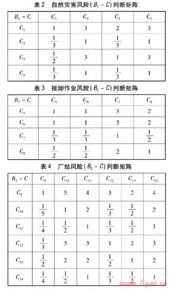 同樣,可以構(gòu)建以具體指標(biāo)層C的元素C1、C2、C3、…、C14相對(duì)于B層各指標(biāo)的兩兩對(duì)比判斷矩陣,詳見表2~4。元素兩兩對(duì)比的重要性采用1~9標(biāo)度法[8],并寫成判斷矩陣形式。構(gòu)造判斷矩陣后,即可通過計(jì)算判斷矩陣的最大特征值及其對(duì)應(yīng)的權(quán)重向量,也就是計(jì)算出某一層次的各個(gè)元素對(duì)于上一層次某一個(gè)元素的相對(duì)重要性權(quán)重。在計(jì)算出某一層次元素相對(duì)于上一層次各個(gè)因素的單排序權(quán)重后,用上一層次因素本身的權(quán)重加權(quán)綜合,即可計(jì)算出C層各因素相對(duì)于4層的層次總排序的權(quán)重。此外,為了評(píng)價(jià)經(jīng)所構(gòu)造的判斷矩陣求出的最大特征值及其對(duì)應(yīng)的權(quán)重向量是否合理,需對(duì)判斷矩陣進(jìn)行一致性隨機(jī)檢驗(yàn)[9~10],檢驗(yàn)各個(gè)專家對(duì)各指標(biāo)相對(duì)權(quán)重判斷的邏輯是否順暢。