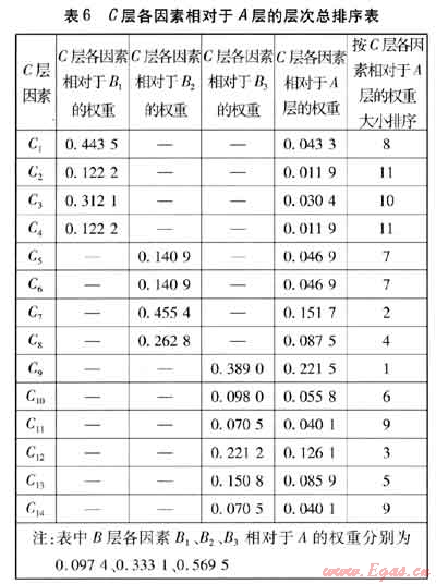 可見,C層各因素相對(duì)于A層層次總排序的計(jì)算結(jié)果滿足一致性,否則,需要重新調(diào)整判斷矩陣,直至滿足一致性。