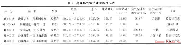 高峰場區(qū)塊氣體鉆井共應(yīng)用5口井——峰003-2、峰003-X3、峰003-4、峰003-5、峰003-6井(表1),氣體鉆井取得的進(jìn)尺較高,總進(jìn)尺9461.29m,3口井按設(shè)計(jì)井段完成,最高機(jī)械鉆速14.68m/h,平均機(jī)械鉆速12.39m/h。氣體鉆井5口井中有2口井無時(shí)間損失,其余3口井總損失時(shí)間1061.89h,其損失時(shí)間很大部分是由于氣體鉆井后的后續(xù)技術(shù)措施不妥造成的。