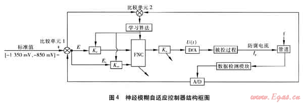 圖4中,F(xiàn)NC表示神經(jīng)模糊自適應(yīng)控制器,A/D表示模數(shù)轉(zhuǎn)換器,D/A表示數(shù)模轉(zhuǎn)換器,Ke表示偏差系數(shù),Kec表示偏差變化率系數(shù),E表示偏差,Ec表示偏差變化率,Ku表示防腐調(diào)整系數(shù),Ip表示實(shí)際防腐電流,f表示干擾信號。干擾信號f來源于大地磁場的波動(dòng)、土壤的濕度和松緊度變化、季節(jié)的變更以及野外強(qiáng)電電位突變等。干擾信號的出現(xiàn),將影響鋼質(zhì)管道管地電位的檢測值且改變管道的腐蝕狀況。