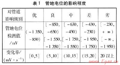 通過實(shí)驗(yàn)研究可知,對于管地電位檢測值U,不同的區(qū)間對管道的腐蝕影響不一樣。當(dāng)管地電位從-850mV向正的方向偏移時(shí),管道被腐蝕;當(dāng)管地電位從-1350mV向負(fù)的方向偏移時(shí),在陰極區(qū)將發(fā)生析氫反應(yīng),對管道的防腐涂層起剝離作用;在區(qū)間(-1350mV,-850mV)時(shí)管地電位達(dá)到國家標(biāo)準(zhǔn),此時(shí)管道的腐蝕影響為最小,對防腐涂層的影響作用也最小,定義此區(qū)間的管地電位值為優(yōu);在(-850mV,-630mV)區(qū)間,管道有輕微的腐蝕作用;在(-1550mV,-1350mV)區(qū)間,管道的陰極區(qū)將發(fā)生析氫反應(yīng),對管道防腐涂層有輕微的剝離作用,此時(shí)定義管道的腐蝕影響是良。如此類推,管地電位全部的區(qū)間影響程度見表1。