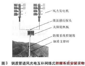 為操作簡單化和防止人為破壞,每臺鋼質(zhì)管道風(fēng)光電互補(bǔ)網(wǎng)絡(luò)式防腐系統(tǒng)安裝在高度為7m的鋼質(zhì)支撐桿上,距地面不得低于5m,其安裝實(shí)物用見圖3。