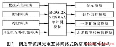 為了實(shí)現(xiàn)系統(tǒng)各部分功能,設(shè)計(jì)一個(gè)以單片機(jī)為核心控制模塊的防腐系統(tǒng),分為9個(gè)功能模塊,分別為單片機(jī)模塊、數(shù)據(jù)采集模塊、野外監(jiān)控模塊、顯示模塊、一體化防腐模塊、無線檢測和短信模塊、風(fēng)光電互補(bǔ)電源模塊、時(shí)鐘模塊、按鍵模塊。系統(tǒng)硬件結(jié)構(gòu)見圖1。