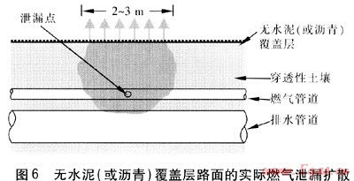 實際管道大部分都埋在城市的道路下面,因此其擴散邊界受水泥或瀝青路面好壞程度影響較大,燃?xì)庖部偸沁x擇最薄弱點擴散到路面。而無水泥或瀝青覆蓋層路面的泄漏情況統(tǒng)計結(jié)果和上面的實驗有所不同,實際上擴散邊界寬度可達(dá)2~3m。