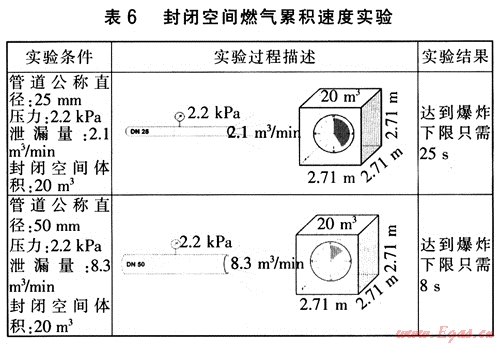 從表6不難看出,燃?xì)庑孤┖笤诜忾]空間的累積速度非???,這就意味著在封閉空間燃?xì)庑孤┓浅NkU。