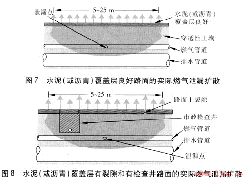 圖7為水泥(或瀝青)覆蓋層良好路面的實際燃?xì)庑孤U散[6、7]。圖8為水泥(或瀝青)覆蓋層有裂隙和有檢查井路面的實際燃?xì)庑孤U散[8]。
