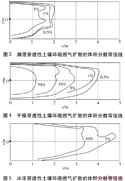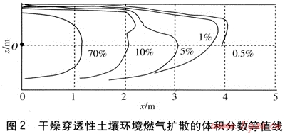 圖1為干燥天氣下穿透性土壤環(huán)境燃?xì)鈹U散的體積分?jǐn)?shù)等值線。圖中原點0為泄漏點(以下各圖同)。