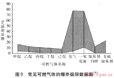 由于可燃?xì)怏w種類很多而性質(zhì)差異很大,為統(tǒng)一地描述其爆炸特性,通常采用爆炸極限這一參數(shù)。特別需要指出的是,某種可燃?xì)怏w的爆炸極限的值是通過實驗得到的客觀恒定值。圖9是常見可燃?xì)怏w的爆炸極限數(shù)據(jù)圖[9],表5是常見可燃?xì)怏w的爆炸極限數(shù)據(jù)表[9]。