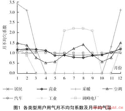參考北京、天津、鄭州、廊坊等用氣特點(diǎn),得到我國北方地區(qū)各類用戶典型月用氣不均勻系數(shù),如圖1所示。其中,采暖、空調(diào)、調(diào)峰電廠用戶用氣的季節(jié)不均勻性較強(qiáng),居民、商業(yè)、工業(yè)、汽車用戶用氣相對平穩(wěn)??照{(diào)、分布式能源、調(diào)峰電廠用戶除能消費(fèi)一部分低谷氣量外,還可以為電力系統(tǒng)削峰,減少峰電建設(shè)投入,同時(shí)提高供電可靠性,是電網(wǎng)的有益補(bǔ)充。