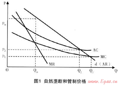 如圖1所示,其中,P表示價格,Q表示產(chǎn)量,d表示需求曲線。在市場上只有一家供貨者來說,市場需求曲線等于單個壟斷廠商所面臨的需求曲線。當(dāng)價格下降時(同時其他條件不變),市場上對產(chǎn)品的需求是增加的。在無管制的情況下,壟斷企業(yè)根據(jù)MR(邊際收益)=MC(邊際成本)的原則確定的產(chǎn)量為Qm,價格為Pm,價格顯然高于邊際成本,此時壟斷企業(yè)利潤最大化。在政府管制的情況下,按照邊際成本定價法即P=MC,企業(yè)的價格下降為P1,產(chǎn)量增加為Q1。但隨之而來的問題是,由于自然壟斷廠商是在AC曲線下降的規(guī)模經(jīng)濟段進(jìn)行生產(chǎn),所以,MC曲線位于AC曲線的下方。即是說,按照邊際成本MC所決定的價格P1一定小于平均成本AC。因此,在這種情況下,企業(yè)是虧損的,企業(yè)會退出生產(chǎn),或者犧牲必需的成本來降低平均成本,但會降低服務(wù)質(zhì)量。