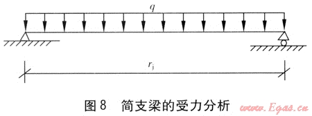 在架空敷設(shè)的供熱管道中,z形架空敷設(shè)的形式也較多見。對(duì)于z形架空敷設(shè)供熱管道,我們考慮兩種敷設(shè)形式:一種是短邊無活動(dòng)支架的敷設(shè)形式,見圖6;另一種是短邊有活動(dòng)支架的敷設(shè)形式,見圖7。在活動(dòng)支架距兩個(gè)轉(zhuǎn)角較近的情況下(見圖6、7),這兩個(gè)活動(dòng)支架上的管段受力可視為簡(jiǎn)支梁受力,受力分析見圖8。