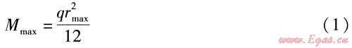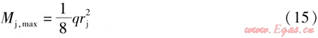 L形架空敷設(shè)形式見圖1,對(duì)于長(zhǎng)直架空敷設(shè)供熱管道,可作為受勻布荷載的等跨距連續(xù)梁處理。設(shè)按強(qiáng)度條件確定的連續(xù)梁活動(dòng)支架最大允許間距為rmax,連續(xù)梁最大截面彎矩Mmax;的計(jì)算式為: