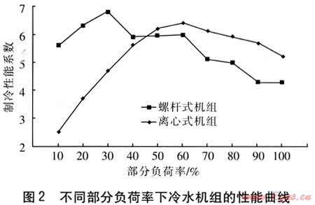 不同部分負(fù)荷率下冷水機(jī)組的性能曲線見圖2。離心式機(jī)組在部分負(fù)荷率為60%時制冷性能系數(shù)最大,而后隨著負(fù)荷增大而降低。螺桿式機(jī)組在滿負(fù)荷運(yùn)行時制冷性能系數(shù)最小,當(dāng)部分負(fù)荷率為30%時最大。