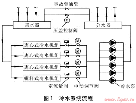 目前,中國每年竣工的建筑面積中公共建筑約4×108m2,在酒店、辦公、商場、教學(xué)樓等大型公共建筑中,空調(diào)系統(tǒng)能耗占建筑總能耗的50%以上,因此公共建筑的節(jié)能更應(yīng)引起社會各方的關(guān)注[1~4]。公共建筑的節(jié)能應(yīng)著手于每個環(huán)節(jié),空調(diào)系統(tǒng)節(jié)能首當(dāng)其沖??照{(diào)系統(tǒng)中,冷水機(jī)組、冷水泵、冷卻水泵及冷卻塔是系統(tǒng)中耗能較高的設(shè)備,根據(jù)冷負(fù)荷對冷水機(jī)的運(yùn)行合理配置,可以提高空調(diào)系統(tǒng)的節(jié)能率,且易于實現(xiàn)。