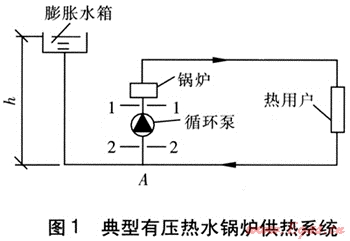 有壓熱水鍋爐是指鍋爐在運行中承受壓力,承受的壓力等于循環(huán)泵揚程與系統(tǒng)定壓點壓力之和,典型有壓熱水鍋爐供熱系統(tǒng)見圖1。由圖1可知,在有壓熱水鍋爐供熱系統(tǒng)中,循環(huán)泵位于回水干管的末端,點A是系統(tǒng)的定壓點。