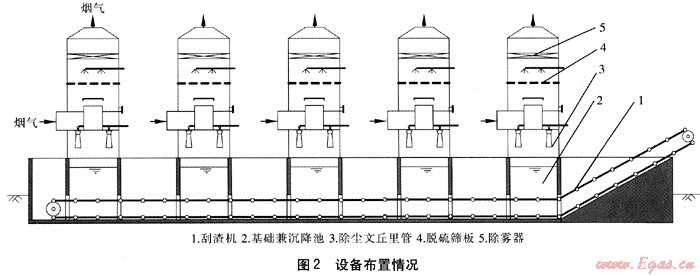 脫硫除塵裝置安裝在原除塵器的位置,底部基礎(chǔ)兼做沉降池,在池底安裝刮渣機(jī),5臺(tái)雙循環(huán)煙氣脫硫除塵裝置基礎(chǔ)連通,共用一臺(tái)刮渣機(jī),沉降的灰渣經(jīng)刮渣機(jī)的框鏈集中運(yùn)輸?shù)交覉?。雙循環(huán)脫硫除塵裝置總阻力比原除塵器僅增加500Pa,因此可保留原引風(fēng)機(jī)。增加一個(gè)除塵水循環(huán)池和一個(gè)堿液循環(huán)池,除塵水循環(huán)池與沉降池連通,除塵水循環(huán)泵將除塵水通過噴頭送入文丘里管與煙氣混合,在喉口處煙塵與液滴充分混合,煙塵被加濕?;咚倭鞒鑫那鹄锕芎鬀_擊液面,被液面捕集,灰渣沉降于池底被刮渣機(jī)清除,清液流回除塵水循環(huán)池循環(huán)使用。堿液循環(huán)泵將堿液送入脫硫塔,在篩板上與除塵后的煙氣混合形成流化床,煙氣中的二氧化硫被吸收,脫硫后的煙氣經(jīng)除霧器脫水后排出,脫硫后的堿液經(jīng)排液口流回堿液循環(huán)池調(diào)整pH值后循環(huán)使用。設(shè)備外部堿液循環(huán)管道和除塵水循環(huán)管道均采用UPVC工程塑料管。