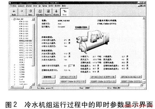 b. 可以根據(jù)運(yùn)行管理的要求,對(duì)設(shè)備進(jìn)行自動(dòng)數(shù)據(jù)采樣。自動(dòng)儲(chǔ)存采樣數(shù)據(jù)或進(jìn)行打印,采樣間隔可設(shè)定為5min~2h。冷水機(jī)組運(yùn)行過(guò)程中的即時(shí)參數(shù)顯示界面見(jiàn)圖2。由圖2可知,冷水機(jī)組的主要運(yùn)行參數(shù)都能在界面中反映出來(lái),包括冷卻水溫度、冷水溫度、流態(tài)、蒸發(fā)器、冷凝器溫度及壓力、壓縮機(jī)運(yùn)行電流等。運(yùn)行人員可通過(guò)界面了解到冷水機(jī)組的即時(shí)詳細(xì)的數(shù)據(jù),以進(jìn)行相應(yīng)的數(shù)據(jù)記錄與分析。