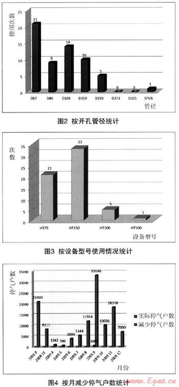 從統(tǒng)計圖中可以發(fā)現(xiàn),主要使用的設備為HT75、HT150系列,約占總數(shù)的90%,主要使用在帶氣開旁通,約占71%,管徑集中在D57—D159,約占90%,在施工過程減少停氣用戶約120000戶,減少了約6400m3燃氣的燃燒排放,節(jié)約1900m3的氮氣置換,避免了約4360h/人·次夜間施工作業(yè)。