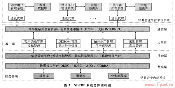 整個系統(tǒng)結(jié)構(gòu)分為企業(yè)外部和企業(yè)內(nèi)部軟件系統(tǒng)。企業(yè)外部軟件系統(tǒng)包括用戶管理系統(tǒng)、設(shè)計部門管理系統(tǒng)和鉆井物資供應(yīng)商管理系統(tǒng),并通過NDERP系統(tǒng)的通訊接口與企業(yè)內(nèi)部系統(tǒng)進(jìn)行信息交換和共享。企業(yè)內(nèi)部軟件系統(tǒng)由系統(tǒng)管理服務(wù)器端和客戶端軟件組成。服務(wù)器端分為數(shù)據(jù)層和平臺層,其中數(shù)據(jù)層是由面向鉆井企業(yè)資源計劃管理和物資供應(yīng)的數(shù)據(jù)庫、模型庫和業(yè)務(wù)流程庫組成;平臺層是根據(jù)企業(yè)的需求定制相應(yīng)的工作流、協(xié)同工作、信息交換等,是NDERP系統(tǒng)柔性和協(xié)作性的一個體現(xiàn)方面??蛻舳朔譃閼?yīng)用層和通訊層,其中應(yīng)用層是由應(yīng)用軟件系統(tǒng)組成,主要是根據(jù)鉆井過程,結(jié)合ERP管理思想,實(shí)現(xiàn)企業(yè)鉆井物資的計劃制定、合理配置和優(yōu)化管理;通訊層是實(shí)現(xiàn)網(wǎng)絡(luò)化鉆井的分布式計算平臺和數(shù)據(jù)信息傳輸平臺。