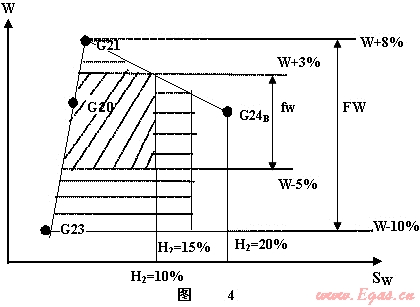 例如英國經(jīng)過流動試驗室對1200個天然氣燃具進行試驗,發(fā)現(xiàn)華白數(shù)每遞增1.5MJ/m3,熱水器與鍋爐煙氣中的CO含量大約增加1倍。因此決定燃氣互換域的華白數(shù)上限為3%,下限為-5%。非正常的界限為:上限8%;下限-10%。英國使用SNG(代用天然氣),需要用IGU的析碳界限氣G24B檢驗。為了避免析碳,英國要求界限氣中H2含量正常界限為10%,非正常界限為15%。同時利用W-SW燃氣互換圖表達了燃氣互換域(見圖4),已經(jīng)把IGU規(guī)定的G24B和歐共體的G222排除在外。圖4中的斜線為正?;Q域??梢娪烊粴獾幕Q域小于IGU和歐共體的天然氣分類的范圍。如果考慮燃氣熱值不允許變化過大時,燃氣互換域,還要進一步縮小。實際上,燃氣互換域是根據(jù)燃具的適應域等因素決定的,當時英國燃具的抗析碳的能力差,縮小了互換域。以上是上個世紀英國使用含H2多的SNG(代用天然氣)作為補充氣源的情況[11]。由此可見,界限氣只是給出了互換域邊界的輪廓不等于互換性已經(jīng)解決。