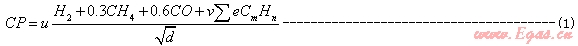 1.燃燒勢(CP)是反映燃具燃燒狀態(tài)的燃氣特性參數(shù)。它既反映燃燒速度對離焰、回火的影響,同時還反映火焰高度對煙氣中CO含量的影響。燃燒勢不是燃燒速度。CP值與燃燒速度也不單純呈比例關系。這樣看來稱其為燃燒速度指數(shù)不是非常合適,也容易與韋弗燃燒速度指數(shù)相混[3] 。