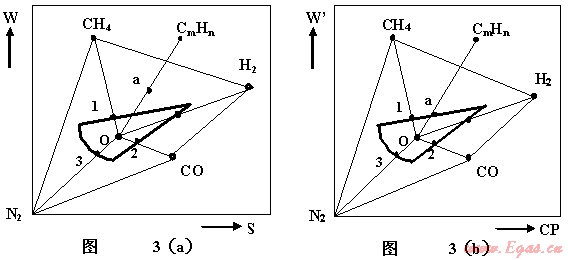 目前,對燃燒勢(Combustion Potential)CP有不同的理解。最可靠的解釋還應該以德爾布博士在同濟大學講課的內(nèi)容為準。上個世紀同濟大學請來德爾布先生來華講學,還印發(fā)了講課的講義[2]。德爾布先生從大氣式燃燒的穩(wěn)定性講起,最后介紹了燃燒勢的產(chǎn)生過程。 德爾布的研究組,開始是使用的是以華白數(shù)為縱坐標,燃燒速度為橫坐標的坐標圖,經(jīng)過試驗在此坐標圖上點出回火、離焰和CO/CO2超標曲線(簡稱CO曲線)。但是當氣源發(fā)展到使用油制氣后,以燃燒速度為橫坐標的坐標圖上得不到光滑的CO曲線,參見圖3(a)。圖中的a點沒有落在曲線1上。這是由于燃燒速度不能全面反映CO曲線的結果。為此需要一個能反映離焰、回火及CO曲線的參數(shù)(或指數(shù))來代替燃燒速度S。于是研究組通過大量試驗整理出燃燒勢CP的公式。將CP 代替S后,得到光滑曲線(具體做法參考[2]、[4])。在W’-CP的圖3(b)中,a值落在曲線1上。說明燃燒勢,不僅反映了離焰、回火,同時還反映了CO曲線。這就是燃燒勢的物理背景[3]。