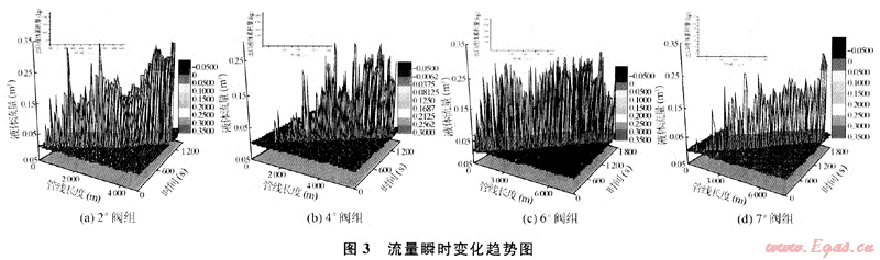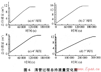從圖3可以看出隨著清管的進(jìn)行,清管器下游段塞長(zhǎng)度逐漸增加。在下游段塞還沒有到達(dá)終端之前,終端的液體流量基本保持在0.0003m3/s左右不變,隨著清管的進(jìn)行,當(dāng)清管器前面的段塞到達(dá)終端后,終端液體流量變化十分劇烈,各閥組終端液體流量由零迅速增加,通過終端的液體累計(jì)量呈線性增長(zhǎng),各閥組出口液體累積量為:4510kg(6#閥組)、13674kg(2#閥組)、6385.6kg(4#閥組)、11012kg(7#閥組);段塞到達(dá)終端后各閥組段塞收集時(shí)間為:101.1s(6#閥組)、100.8s(2#閥組)、40.1s(4#閥組)、40.3s(7#閥組)。當(dāng)清管結(jié)束后,終端液體流量接近零,幾乎全為氣體即出現(xiàn)了所謂的段流現(xiàn)象。在整個(gè)清球過程中,液體流量在地形起伏較大的上升管段和下降管段的凹凸結(jié)合處會(huì)發(fā)生較大的波動(dòng)。這是流體在上升管路處清管器前端液體由于自重堆積造成的結(jié)果;而在下降管路處由于清管器前后端液體自重及清管器自重的影響使清管器前端液體流速迅速增加。這種現(xiàn)象對(duì)高程變化較大的4個(gè)閥組尤為明顯。