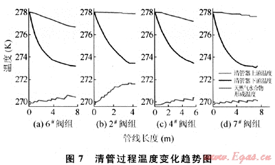 分析,獲取了清管后各閥組管線恢復(fù)穩(wěn)態(tài)的時(shí)間。采用瞬態(tài)分析方法對(duì)清管器運(yùn)行中溫度變化研究的結(jié)論表明:各閥組在清管過程中沒有天然氣水合物的形成。進(jìn)一步驗(yàn)證了清管節(jié)流理論的正確性。