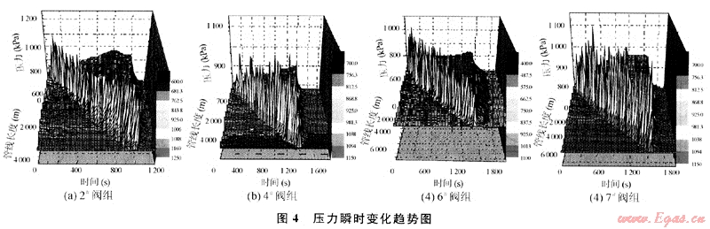 各閥組由于地形變化起伏大,壓力波動(dòng)隨著管線的起伏也發(fā)生了較大的變化(見圖4)。從圖中可以看到壓力波動(dòng)的位置出現(xiàn)在段塞出現(xiàn)處和管線走向發(fā)生改變的地方。在通球過程中各閥組流體壓力變化具有共同的特征:當(dāng)清管器放入管道后,由于清管器后部流體被阻,上游氣體被壓縮使清管器上游壓力急劇升高,清管器運(yùn)動(dòng)后,上游重新恢復(fù)到新的穩(wěn)態(tài);清管器下游由于流體連續(xù)性的中斷,開始時(shí)下游流體壓力急劇下降,清管器經(jīng)過后,由于氣體得以補(bǔ)充,原下游下降的壓力開始上升。清管器剛經(jīng)過時(shí),在清管器上游一定長(zhǎng)度的管段內(nèi)幾乎沒有液體存在,使清管器上游壓力幾乎相等,僅由于阻力損失使壓力出現(xiàn)微小的差別;當(dāng)清管操作完成后,各管段經(jīng)過一段時(shí)間重新達(dá)到了新的穩(wěn)態(tài)。