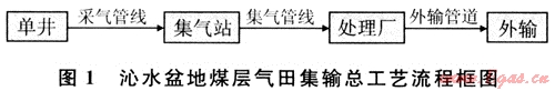 為了更好地開(kāi)發(fā)建設(shè)沁水盆地煤層氣氣田,我們依據(jù)開(kāi)發(fā)方案、煤層氣性質(zhì)、當(dāng)?shù)刈匀粭l件以及商品氣需求和流向等,并借鑒長(zhǎng)慶氣區(qū)蘇里格氣田天然氣集輸工程的實(shí)踐經(jīng)驗(yàn),制定了沁水盆地煤層氣田地面集輸總工藝流程[1],如圖1所示。為了更深入地了解沁水盆地煤層氣田地面集輸工藝特點(diǎn),以蘇里格氣田天然氣集輸工程為對(duì)比,重點(diǎn)介紹了沁水盆地煤層氣田開(kāi)發(fā)方案所提供的氣井基本參數(shù)、地面建設(shè)采用的井場(chǎng)、采集系統(tǒng)、集氣站場(chǎng)及處理廠工藝。