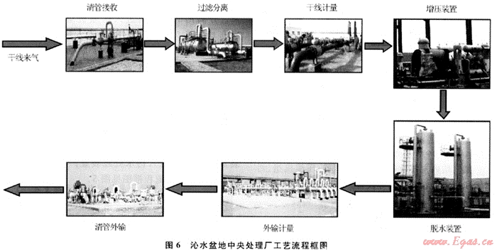 原料氣進(jìn)廠前設(shè)緊急截?cái)嚅y,可在中央處理廠或集氣干線緊急情況下的自動(dòng)切斷。氣體先進(jìn)入集氣裝置經(jīng)過(guò)濾分離器分離出攜帶的液體及粉塵等雜質(zhì),經(jīng)計(jì)量后輸往增壓裝置,再進(jìn)入脫水裝置,脫水后的凈化氣計(jì)量后去輸氣管道首站進(jìn)入就近的西氣東輸主管道。沁水盆地中央處理廠工藝流程框圖見(jiàn)圖6。