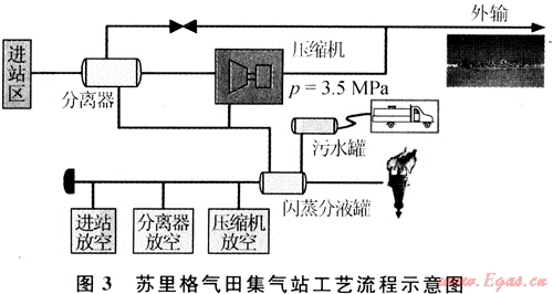 集氣站內(nèi)主要設(shè)備有氣液分離器、壓縮機(jī)組、污水罐和清管器收發(fā)球筒等設(shè)備。其工藝流程見(jiàn)圖4。