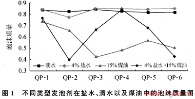 實(shí)驗(yàn)分別考察了不同種類(lèi)起泡劑在清水、鹽水、煤油以及鹽水和煤油的共同作用下的泡沫質(zhì)量。結(jié)果表明非離子表面活性劑QP-1的效果最佳,鹽、油對(duì)其泡沫質(zhì)量的影響小,其值均在0.75以上,故實(shí)驗(yàn)優(yōu)選QP-1作為抗油防塌泡沫體系的發(fā)泡劑。