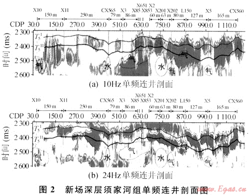 地震波在含氣儲(chǔ)層和含水儲(chǔ)層中傳播時(shí),振幅、頻率和能量等動(dòng)力學(xué)屬性將會(huì)發(fā)生變化。但是,兩者的變化程度可能存在差異,且在時(shí)間域內(nèi)卻很可能難以發(fā)現(xiàn)。時(shí)頻分析技術(shù)可以將時(shí)間域的地震信號(hào)變換到時(shí)間-頻率域進(jìn)行解釋?zhuān)跁r(shí)間-頻率域內(nèi)突出含氣儲(chǔ)層和含水儲(chǔ)層之間的地震響應(yīng)差異。將該方法應(yīng)用到川西坳陷深層須家河組氣藏的含氣性檢測(cè)中,在時(shí)頻域內(nèi)利用“低頻陰影”、“高頻衰減”等含氣響應(yīng)特征,對(duì)含氣儲(chǔ)層和含水儲(chǔ)層進(jìn)行了有效區(qū)分。