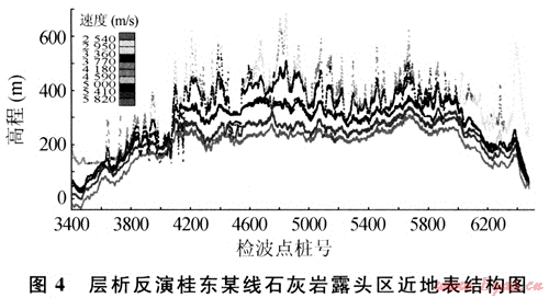 圖4為層析反演桂東石灰?guī)r露頭區(qū)某測(cè)線的近地表結(jié)構(gòu)。不少人認(rèn)為如此石灰?guī)r露頭區(qū)不會(huì)有低速帶,可層析反演的結(jié)果明顯看出,盡管野外看起來還是石灰?guī)r,但它的表層速度卻只有2000m/s,而且隨著深度的增加逐漸變高,直至沒有風(fēng)化到的高速層面附近原始石灰?guī)r處。其低速帶速度在2000~5000m/s之間,厚度橫向高頻變化。降速帶速度在5000m/s以上,厚度不是很大。可見,其靜校正量的長(zhǎng)周期變化很小,也不會(huì)超過一個(gè)排列長(zhǎng)度,主要還是高頻成分。