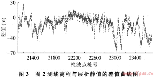 圖3是圖2測(cè)線高程與層析靜值的差值曲線。該曲線是對(duì)近地表結(jié)構(gòu)的非均質(zhì)性測(cè)量,反映出近地表結(jié)構(gòu)對(duì)地震波場(chǎng)的影響。可以看到,該風(fēng)化類型的靜值周期有長(zhǎng)有短,長(zhǎng)周期將影響構(gòu)造形態(tài),短波長(zhǎng)將影響地震成像質(zhì)量。