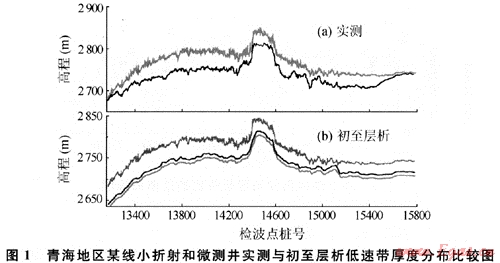 該例子比較典型,因?yàn)樵搮^(qū)低速帶與降速層分界面很清楚,速度差異比較大。無論用小折射測(cè)量、微測(cè)井測(cè)量還是初至波層析反演,不同操作人員的解釋,其速度分層結(jié)果會(huì)基本一致。而通常情況下,當(dāng)?shù)汀⒔邓賻Эv向上速度變化梯度復(fù)雜時(shí),小折射法、微測(cè)井法、層析方法會(huì)因?yàn)槿藗兊恼J(rèn)識(shí)和分層方式不同,其分層結(jié)果出現(xiàn)多解性。