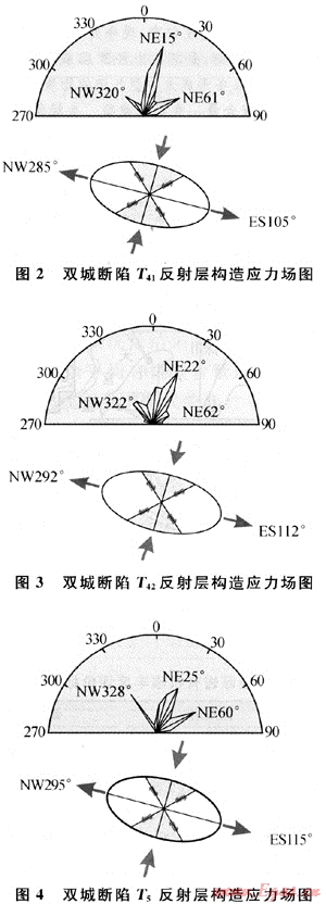 通過上述方法的研究分析后認(rèn)為:①雙城斷陷伸展時期原始邊界主斷層走向?yàn)镹NE15°~25°;②兩個共軛張扭斷層(走滑斷層)方向分別為NEE60°~62°和NW320°~328°;③雙城斷陷火石嶺組營城組火山巖段沉積時期構(gòu)造應(yīng)力場為主張應(yīng)力,方向?yàn)镹W(285°~295°)-SE(105°~115°),主壓應(yīng)力方向:NE(15°~25°)-SW(185°~205°)。
