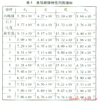 可燃性指數(shù)Cb主要反映煤樣燃燒前期的反應(yīng)能力,該值越大,表明可燃性越好。各煤樣的可燃性指數(shù)Cb見(jiàn)表4。由表4可知,單煤樣中,石下江煤、新東煤的可燃性較好,烏峰煤的可燃性較差?;烀旱目扇夹曰窘橛趦煞N單煤的可燃性之間,且隨著某種單煤比例的增加,混煤的可燃性指數(shù)Cb逐漸向該煤種靠近。烏峰煤與石下江煤按2:8摻混時(shí),混煤的可燃性明顯變好。