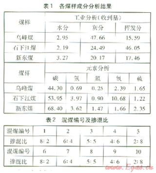 實(shí)驗(yàn)用煤為烏峰煤、石下江煤、新東煤3種單煤,將烏峰煤分別與石下江煤、新東煤按不同比例摻混[5] 。