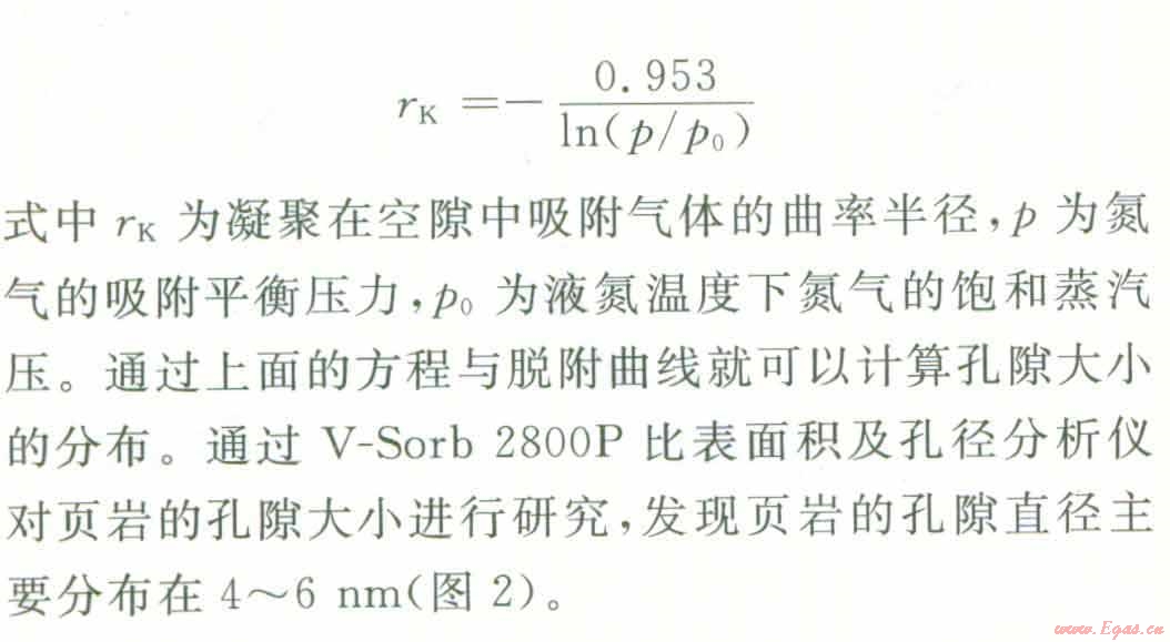 孔隙按大小可分為大孔(直徑大于50 nm),介孔(直徑介于2~50 rim)、微孑L(直徑小于2 nm)。利用氣體在頁巖孑L隙中的吸附與解吸可以測量其孔隙大小及其分布情況,當(dāng)壓力低于氣體的臨界壓力時,對于介孔與大孔,首先發(fā)生多層吸附,相對壓力更高時,則發(fā)牛毛細(xì)管凝聚,形成類似液體的彎液面。介孔孔徑分布一般用Kelvin方程進(jìn)行計算。以氮氣作為吸附氣體時,當(dāng)液氮溫度為77 K時,Kelvin方程可表述如下: