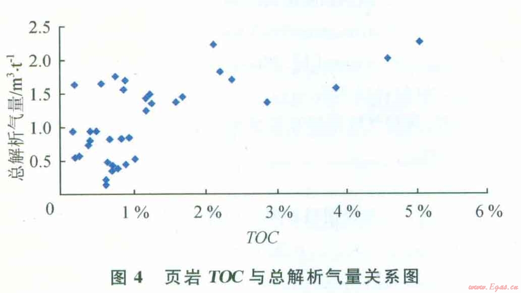 圖3是頁巖氣的總解析氣量與頁巖的孔隙度的關(guān)系圖,從圖中可以看到該頁巖氣藏的孔隙度與總解析氣量并沒有明顯關(guān)系。圖4是頁巖的總解析氣量與TOC關(guān)系圖,從圖中可以看到兩者存在著明顯的正相關(guān)關(guān)系,隨著頁巖的有機(jī)質(zhì)含量的增加,頁巖的總解析氣量也是增加的。美國5大頁巖具有豐富的有機(jī)質(zhì)含量,其TOC大多介于l.5%~20%,通常認(rèn)為總有機(jī)質(zhì)含量超過0.5%的頁巖是具有潛力的烴源巖。通過對該頁巖氣藏巖心的有機(jī)地化分析,其TOC介于0.5%~5%,其TOC使其可能成為具有潛力的烴源巖。根據(jù)美國和加拿大的勘探開發(fā)結(jié)果,對于熱成因的頁巖氣藏,形成頁巖氣的頁巖有機(jī)質(zhì)成熟度(R。,)值為0.4%~3.o%。陔頁巖氣藏的R。值范圍為2.75%~3.92%,R。值超過3%說明處于過成熟范圍,會影響頁巖氣體的吸附量。