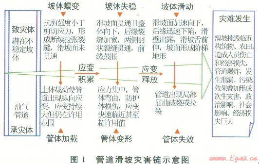 災(zāi)害監(jiān)測的關(guān)鍵是及時發(fā)現(xiàn)災(zāi)變前兆,進而做出預(yù)報預(yù)警。地質(zhì)災(zāi)害的“致災(zāi)性”難以逆轉(zhuǎn),但管道地質(zhì)災(zāi)害是典型的、致災(zāi)體與承災(zāi)體之間明顯相關(guān)的“因果型災(zāi)害鏈”,只要適時掌握其應(yīng)變釋放的過程性指征和指標(biāo),就有可能及時預(yù)警,“防患于未然”。圖1以管道滑坡災(zāi)害鏈為例,勾勒了管道滑坡從應(yīng)變積累到應(yīng)變釋放的交互作用和演進過程[4],這一過程也給災(zāi)前預(yù)警和災(zāi)害治理提供了理論依據(jù)。